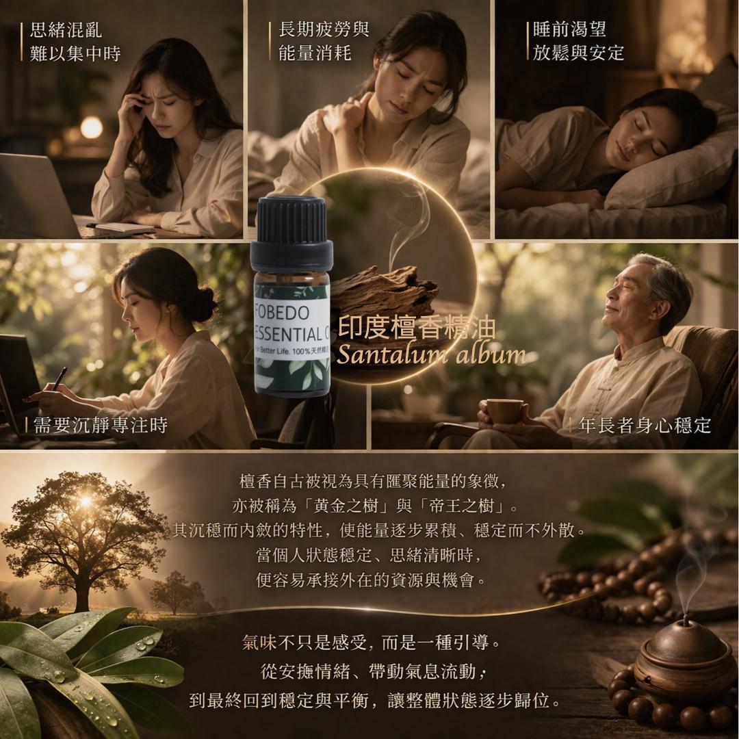 由於其高品質與稀缺性,60年心材檀香同時具備顯著的寧心與穩定特性,是少數能兼具氣味深度與身心支持性的精油之一。對於年長者或長期耗能族群而言,更是一種溫和而持續的陪伴。