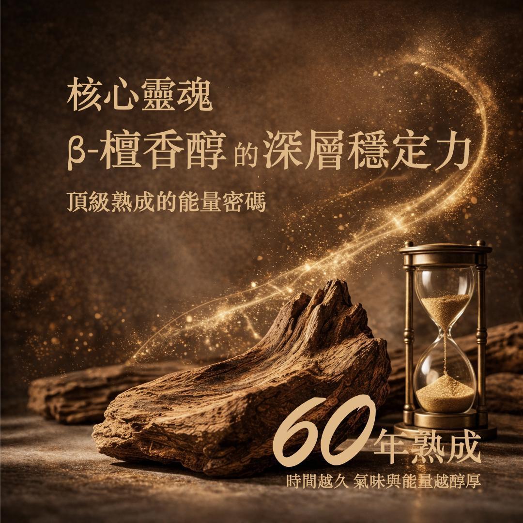 這樣的氣味層次,來自長時間熟成的心材結構。檀香需約20年以上才開始形成 β-檀香醇,而60年心材所累積的比例與穩定度,使其氣味更為圓潤、細緻且具有深度。