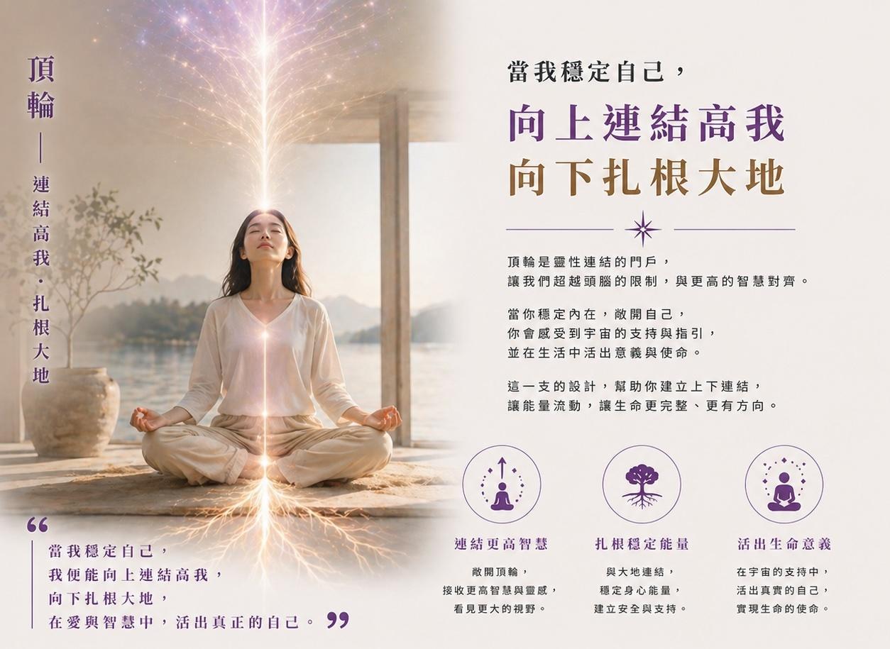 精油結構以阿曼乳香作為核心,帶出內在的收斂與聚焦,使注意力回到中心;藍蓮花帶出向上的開展與感知,使頭頂的位置能夠打開並延伸;沒藥提供穩定與收束,使整體不浮動;冷杉與絲柏建立清楚的縱向軸線,讓從下到上的連續性更加明確。
