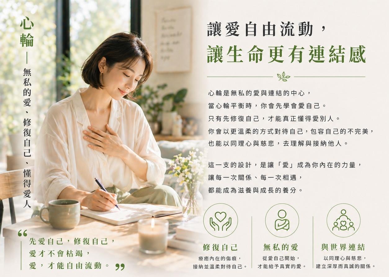 如果你不知道從何下手,就先從心輪開始吧。這一支的設計,往內心更深一層去前進:讓累積在身體裡的情緒,獲得放鬆,讓心中的流動慢慢恢復,情緒在這個過程中逐漸被修復,而不是被推動。
