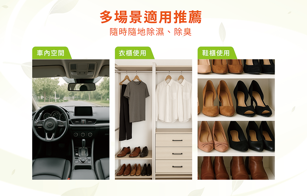 放入櫃子或密閉空間,有效吸濕防霉,維持乾燥無異味。